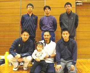 選手紹介 西岡 由起憲 部長兼主将。ダブルスのスペシャリスト。たまに、相方を疲れさせてしまうが… (上中央) 課題であるレシーブ強化し、40の大台にのったことで渋いプレーに磨きを掛ける。 斎藤 新一郎 ここ一番で頼りになるエース。華麗なフォームは誰もが憧れる。 (上左) 練習しないと動きもあたりも悪いのが心配なところ。肉体改造に励むか? 梅田 知昭 小さな応援団が強い味方?クレバーなプレーができる。体力はチーム一! (下左) 監督は必殺技の会得を願っている。いらないという声もあるが… 青木 隆二 チームの年長者だが、攻撃力は素晴らしい。必殺ハエ叩きがうなる!! (上右) スピード勝負に飽きたら、小技の会得をして欲しい。監督の切なる願望。 勝又 欣哉 チーム一騒がしい!が、このところ安心してプレーが見られる。 (下右) 斎藤選手と共にチームを支える。とにかく良く動き、野生の本能でプレーする。 瀬戸 政明 指導が多く自分の練習があまり出来ないのが現状。フェイントを信条としている。 (下中央) 重要な課題として体力増強が挙げられる。飲み過ぎで体が重い。 |